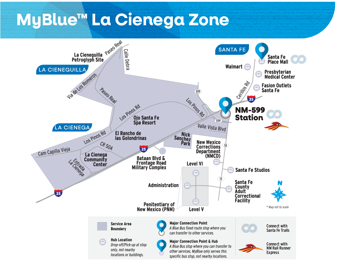 ¡Hay una nueva forma de moverse por La Cienega! Es flexible, conveniente y sin tarifa hasta el 30 de enero. MyBlue™ ahora está sirviendo a la Zona La Cienega, dando a los pasajeros una manera fácil de viajar alrededor de La Cienega y a centros de Santa Fe como el Presbyterian Santa Fe Medical Center, Walmart en Santa Fe, Santa Fe Place Mall, NM-599 Station, Fashion Outlets of Santa Fe y más!